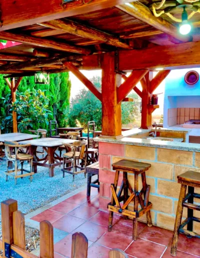 En el exterior privado, Villa Covadonga tiene su porche amueblado con vistas a la zona de barbacoa y bar, al jardín con fuente y a la piscina con solárium. Cuenta con multitud de mobiliario y detalles de carpintería andaluza realizados a mano, encontrándose todo el entorno rodeado de cipreses, creando un ambiente único y acogedor.